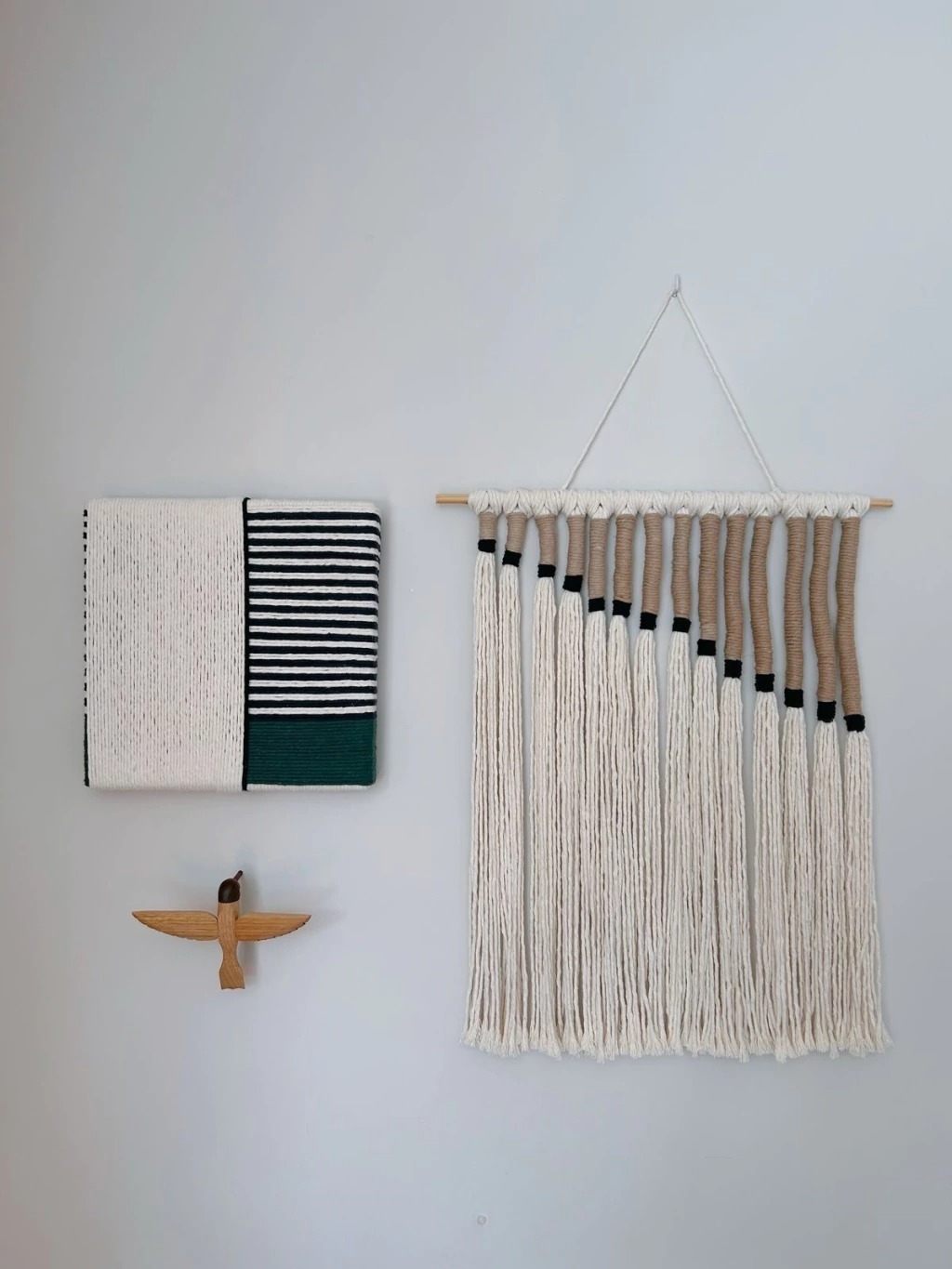 DESCRIÇÃO: O Painel Macramê Line Colors é uma peça única que combina fio de algodão cru, marrom e preto. Com um design exclusivo, ele traz um toque especial à decoração da sua casa. Este painel é confeccionado com fios ecológicos, provenientes de tecidos descartados da indústria têxtil, tornando-o um objeto sustentável e consciente.