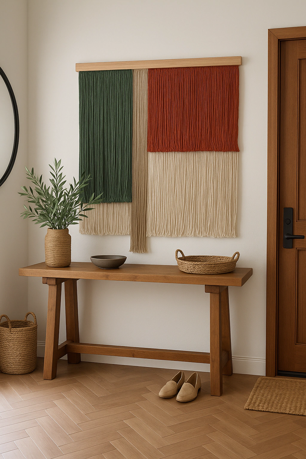 DESCRIÇÃO: O Painel Macramê Vertical Line Raizes é uma peça que combina verde militar, bege, terracota e de algodão cru. Com um design exclusivo, ele traz um toque especial à decoração da sua casa. Este painel é confeccionado com fios ecológicos, provenientes de tecidos descartados da indústria têxtil, tornando-o um objeto sustentável e consciente.
